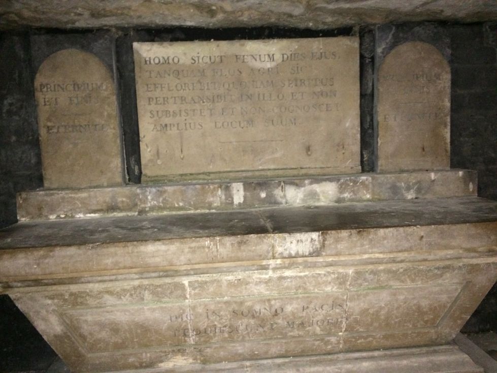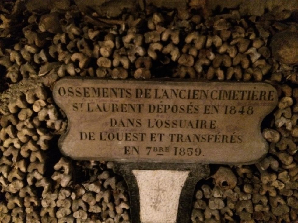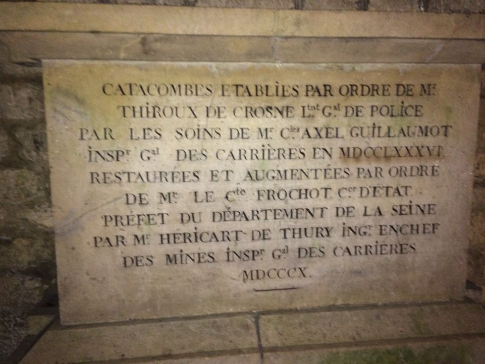 “Catacombes established by order of Monsieur Thiroux de Crosne, Lt. General of Police, and by Monsieur Guillaumot, Inspector General of Quarries, 1786. Restored and improved by order of Monsieur Frochot, Secretary of State, Chief of the Department of the Seine, by Monsieur Hericart de Thury, Chief Mining Engineer, Inspector General of Quarries, 1810.”