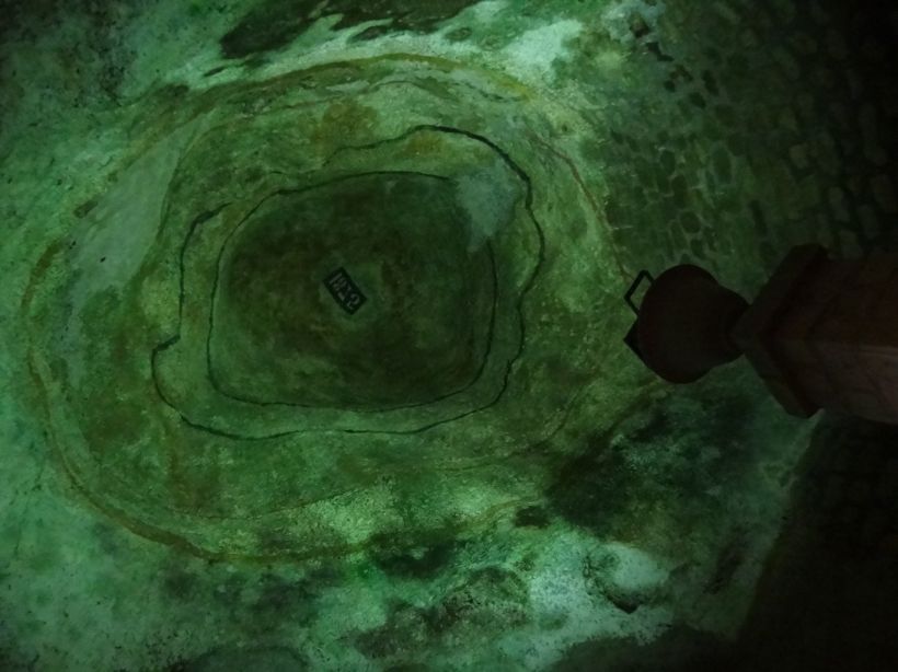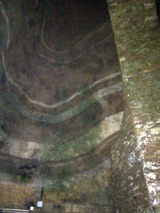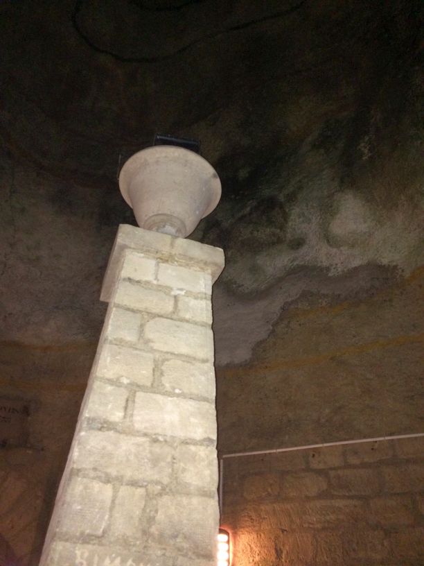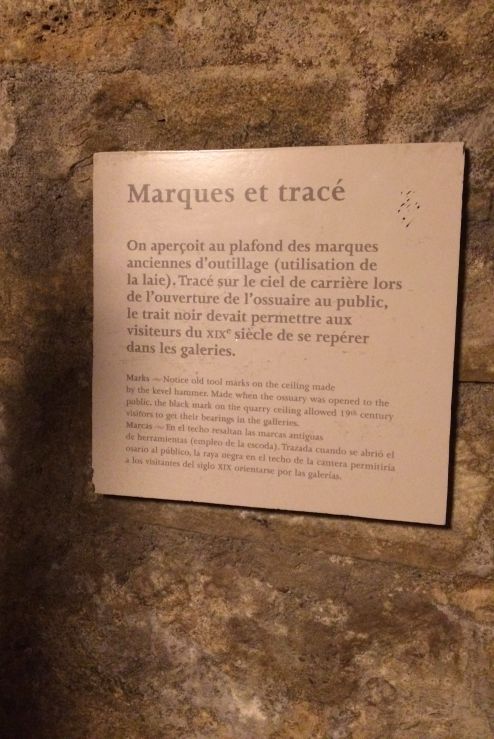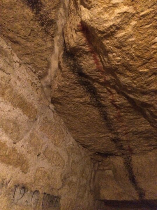 Marks on ceiling: notice old tools marks on the ceiling made by the kevel hammer. Made when the ossuary was opened to the public, the black mark on the quarry ceiling allowed 19th century visitors to get their bearings in the galleries.
