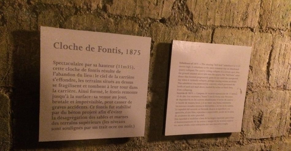 The next corridor leads to a gallery consisting of a number of subsidence sinkholes (fontis) consolidated between 1874 and 1875, three of which are over ten meters deep. The rubble that had collapsed from the ceiling has been excavated and allows the viewer to observe its bell-shaped structure.
