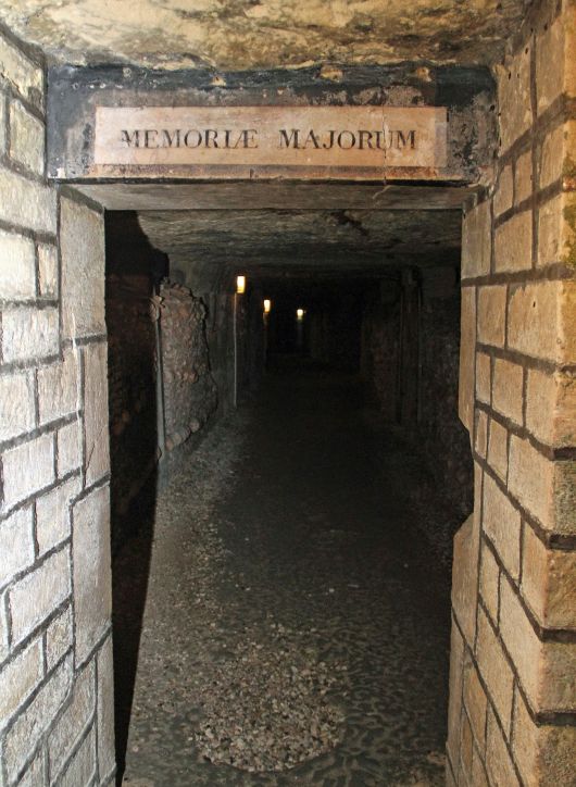 We are now entering the ossuary portion of the Catacombs. The entrance door is a low portal with an engraved lintel in Latin - MEMORIAE MAJORUM – “in memory of the ancestors.” The reverse side of the lintel states “Wherever you go, shadowlike death will follow"