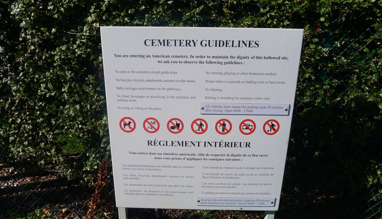 A large panel with Cemetery guidelines posted in the parking lot. The cemetery is open to the public daily, except on December 25 and January 1. Hours of operation are 9 a.m. to 6 p.m. from April 15 to September 15, and 9 a.m. to 5 p.m. the rest of the year. It is open on host country holidays. When the cemetery is open to the public, staff members are on duty in the visitor center to answer questions and escort relatives to grave and memorial sites