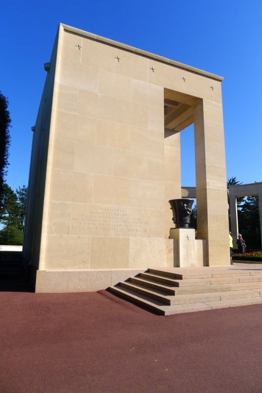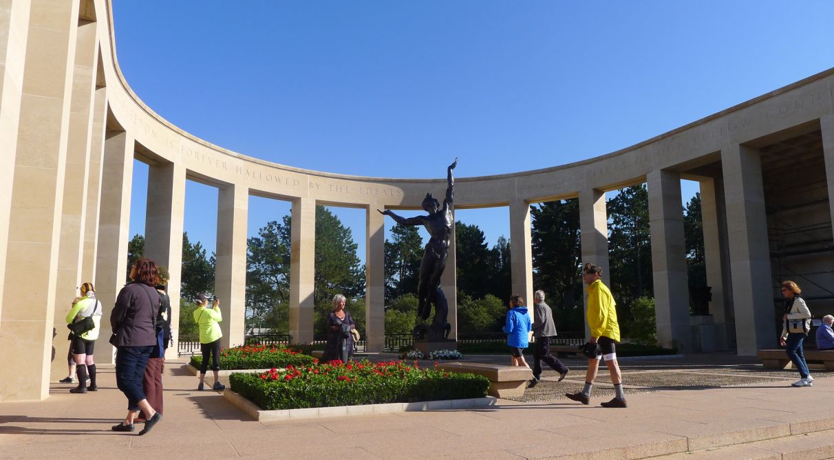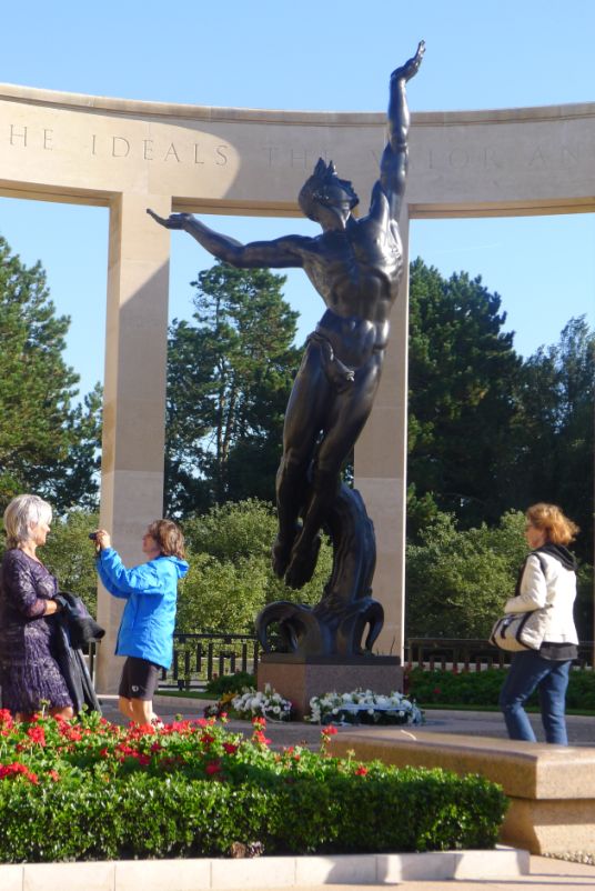 The memorial consists of a semicircular colonnade with a loggia at each end containing large maps and narratives of the military operations; at the center is the bronze statue, “Spirit of American Youth Rising from the Waves.” An orientation table overlooking the beach depicts the landings in Normandy.