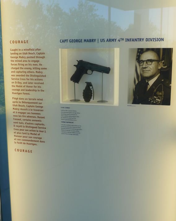 Courage: Caught in a minefield after landing on Utah Beach, Captain George Mabry pushed through the mined area to engage forces firing on his men. He charged the enemy, killing some and capturing others. Mabry was awarded the Distinguished Service Cross for his actions on D-Day, and later received the Medal of Honor for his courage and Leadership in the Huertgen Forest.