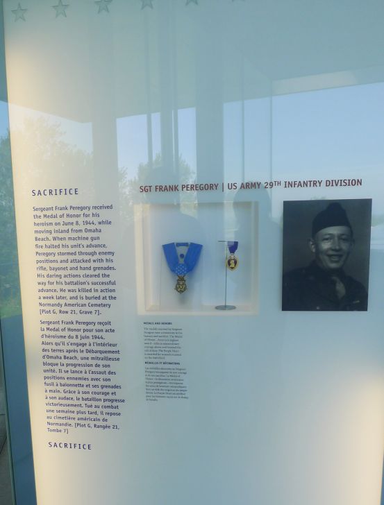 Sacrifice: Sergeant Frank Peregory received the medal of honor for his heroism on June 8, 1944, while moving inland from Omaha Beach. When machine gun fire halted his units' advance, Peregory stormed thought enemy positions and attacked with his rifle, bayonet and hand grenades. His daring actions cleared the way for his battalion's successful advance. He was killed in action a week later, and is buried at the Normandy American Cemetery-Plot G , Row 21, Grave 7