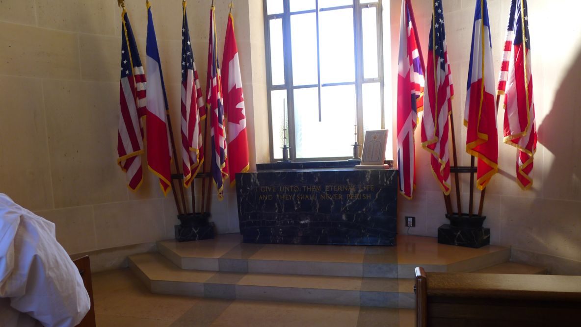 A large operations maps with narratives and flags of American military services, overlooks the burial area.