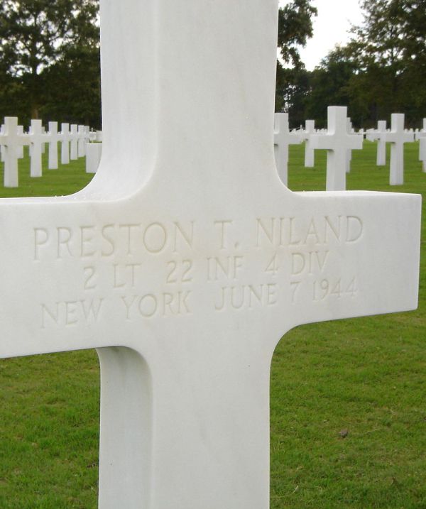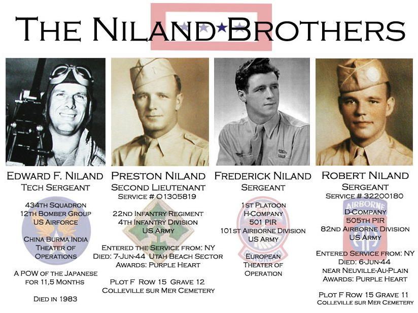Preston Niland's grave. The Niland brothers were four American brothers from Tonawanda, New York, serving in the military during World War II. Of the four, two survived the war, but for a time it was believed that only one, Frederick "Fritz" Niland, had survived. After the reported deaths of his three brothers, Fritz was sent back to the United States to complete his service and only later learned that his brother Edward, missing and presumed dead, was actually captive in a Japanese POW camp in Burma. Steven Spielberg's 1998 film Saving Private Ryan is loosely based on the brothers' story. |