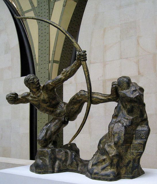 Hercules the Archer by Emile-Antoine Bourdelle Not only the hero's victory over the monsters, but also Bourdelle's victory over his own high-spirited inspiration, this work is remarkable both for its tension and for its balanced construction. The dynamics come from the interaction of solids and voids, brutal force and balance. The nude figure denotes power, high-strung energy, pulled taut between the arm bending the bow and the foot braced against the rock. |
