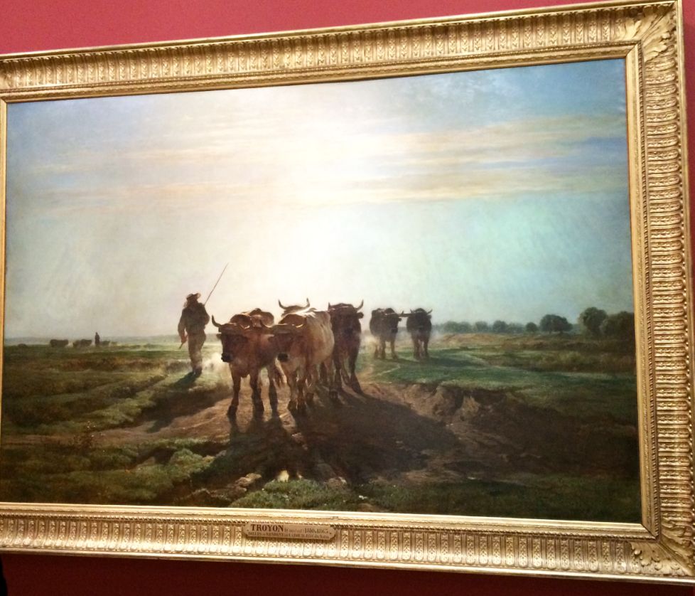 In 1846, Troyon travelled to the Netherlands, where he saw the cattle paintings of Paulus Potter, and studied the works of the Dutch Masters. As a result, his subject matter and style changed, and he concentrated on painting farm animals in landscapes. These quickly became very successful, and he was awarded a total of five medals for his paintings shown in the Paris Salon, and the Legion of Honor. In this painting Troyon painted by incorporating the morning light and captured the steamy breath of cattle Going to Work.