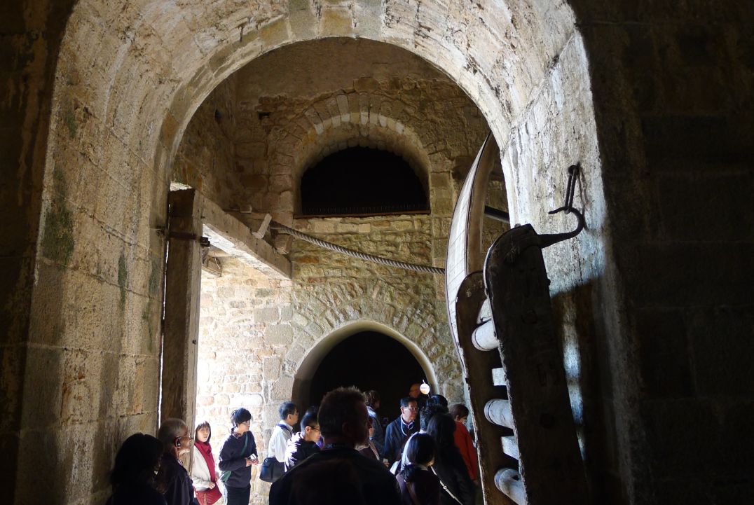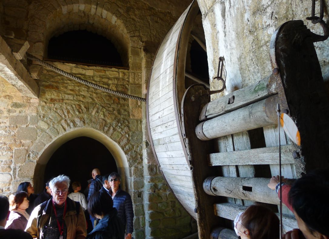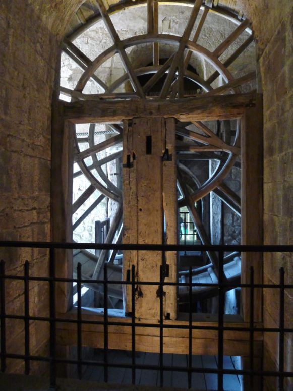 Following the dissolution of the religious community during the Revolution, and until 1863 the abbey was used as a prison. This wheel was installed around 1820 in order to hoist provisions to the prisoners held in the abbey when it was turned into a prison. It is a replica of the pulleys used for hoisting building materials in the Middle Ages.