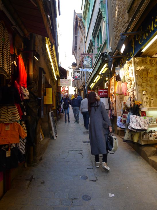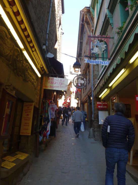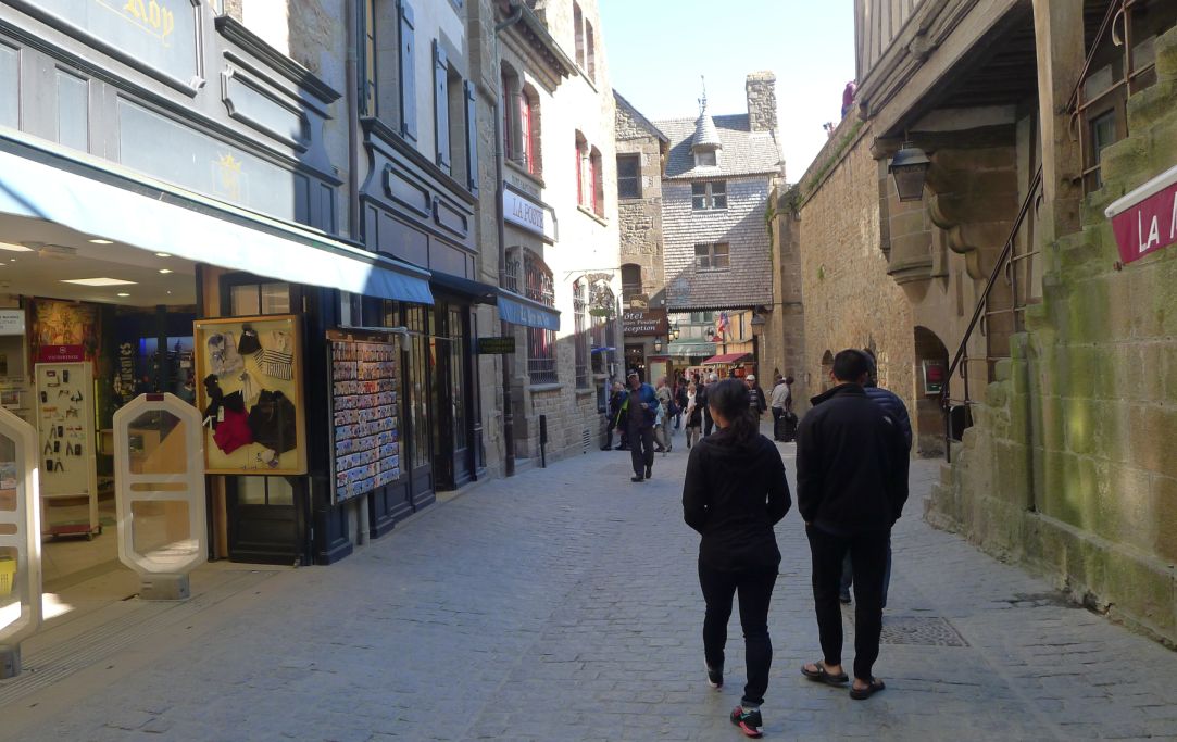 Then walk through the Boulevard Gate and then the King's Gate to arrive at the Grand Rue. This charming street is lined by tightly-packed stone houses of the 15th and 16th centuries, which now are occupied by souvenir shops, snack bars, cafés, restaurants, and hotels, including the famous Auberge Mère Poulard.