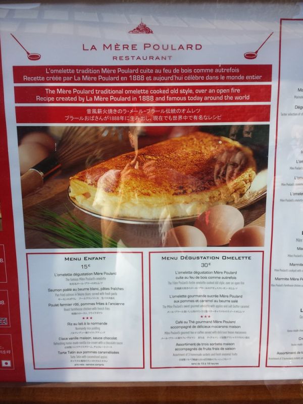 Kevin and Kristie ordered each a traditional omelet (mere Poulard style)-€16. They ripped you off her but they are not a lot of choice so they can get what they ask for.