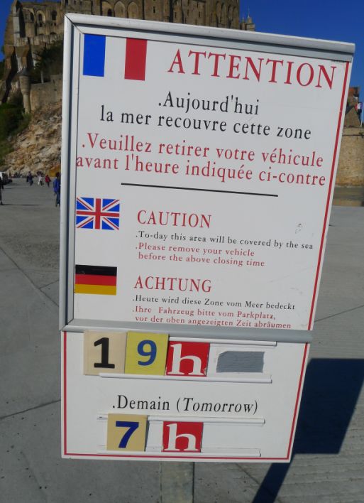 The tide rises out of a wide sandy bay with one of highest tide in Europe. Warning sign that this area will be covered by the sea by 7:00PM |