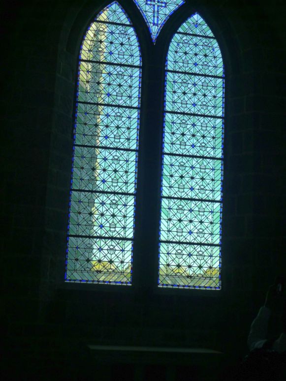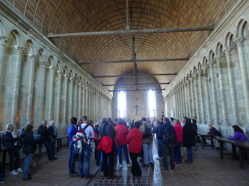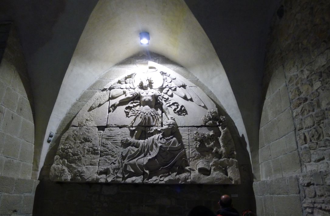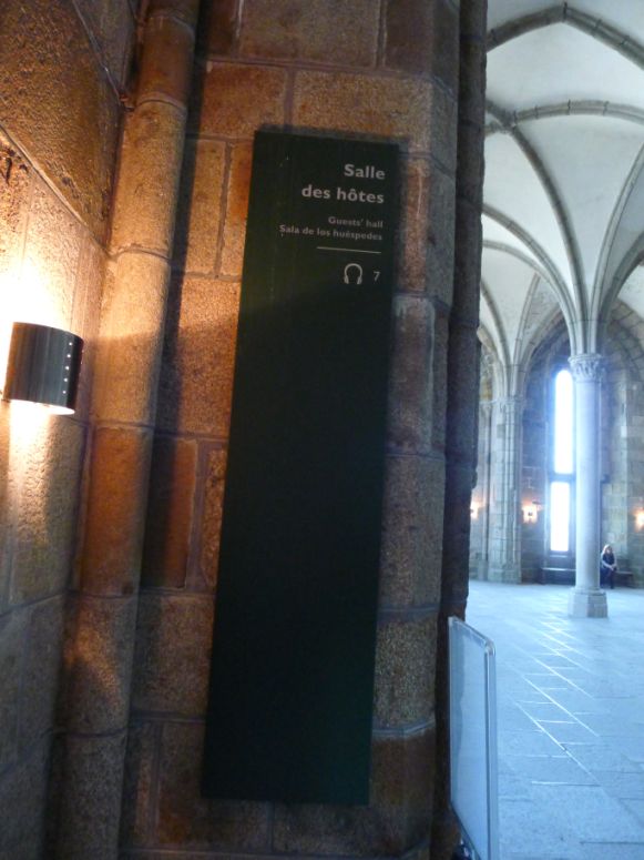 As we went down some stairs to the Salle des Hôtes (hall of guests) a bas relief by sculpture Auguste Barre, which dates to around 1860 and depicts the dream of St. Aubert.