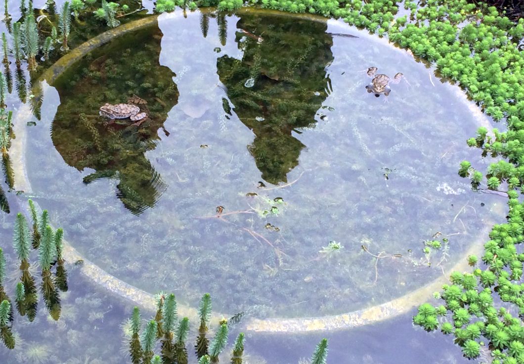 Pond with a two large frogs that I can see and lots of tots