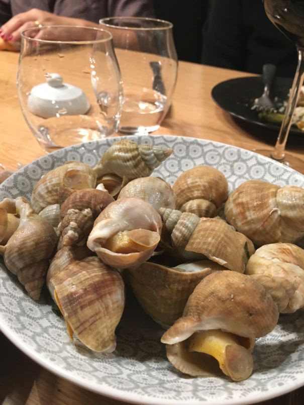Bulots cuits aux aromates, mayonnaise. Type of snails cooked with herbs and served with mayonnaise. |