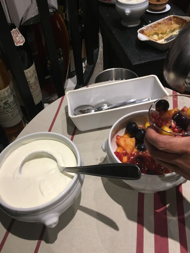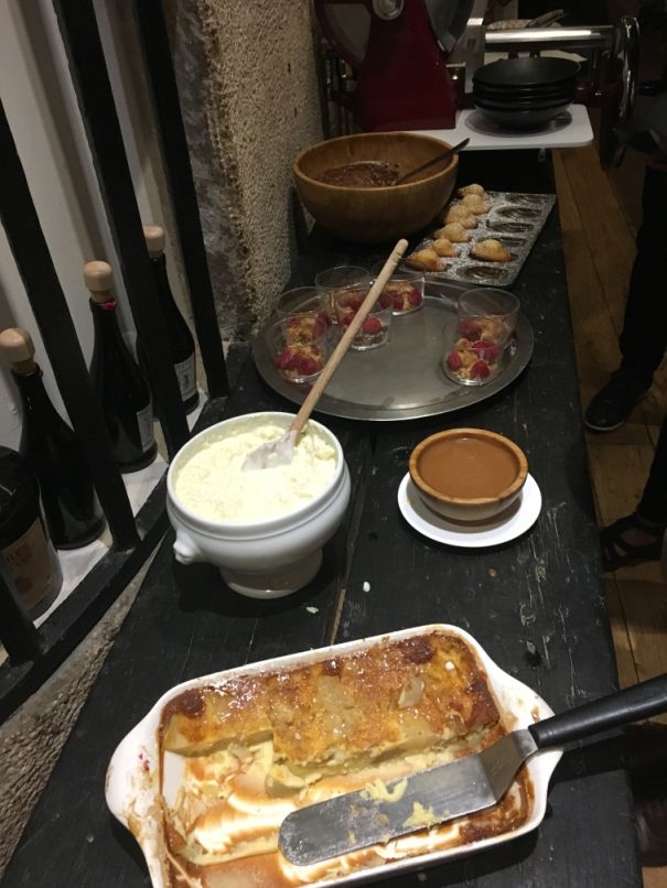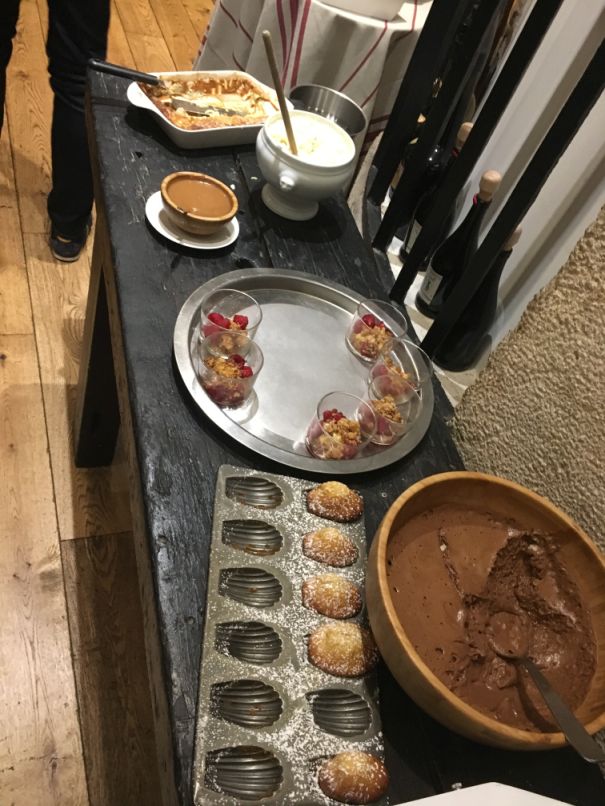 ![]() Madeleine, chocolate mousse, Sable aux framboises, riz au lait with caramel sauce, and a clafoutis aux poires. |