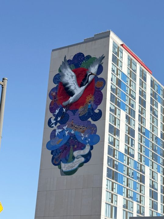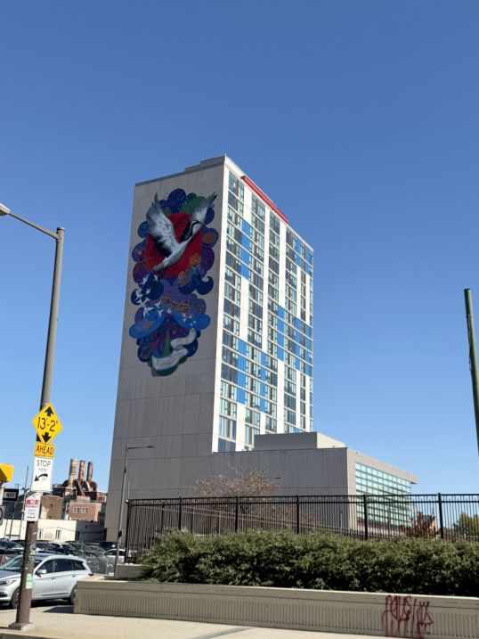 The mural you are seeing is called “Soaring Toward the Future.” It features a large bird in motion with wings fully extended, surrounded by smaller white birds against a vibrant, colorful background. The imagery suggests movement, hope, freedom, and collective uplift, a common theme in many Philadelphia murals.