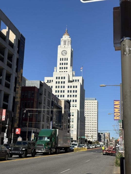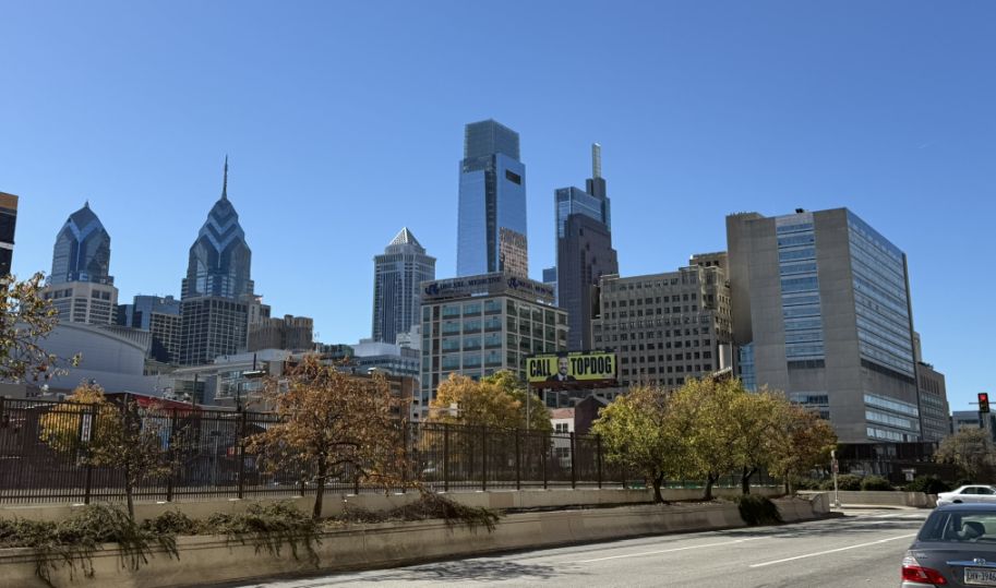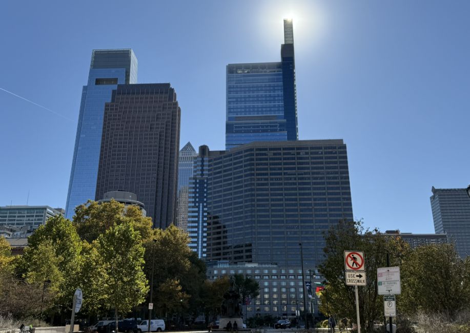 From where we are standing, we get one of the classic north‑side views of Center City. The buildings ahead are a mix of older, pointy‑roof skyscrapers and newer glass towers. There is one of the right that looks like a “USB stick to me, it is actually the Comcast Technology Center.