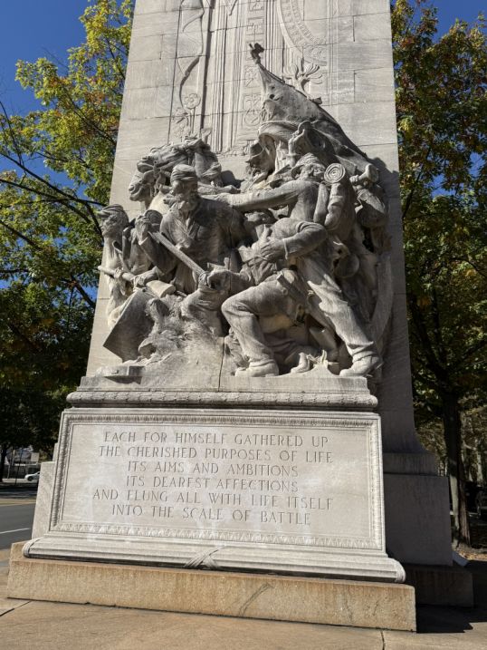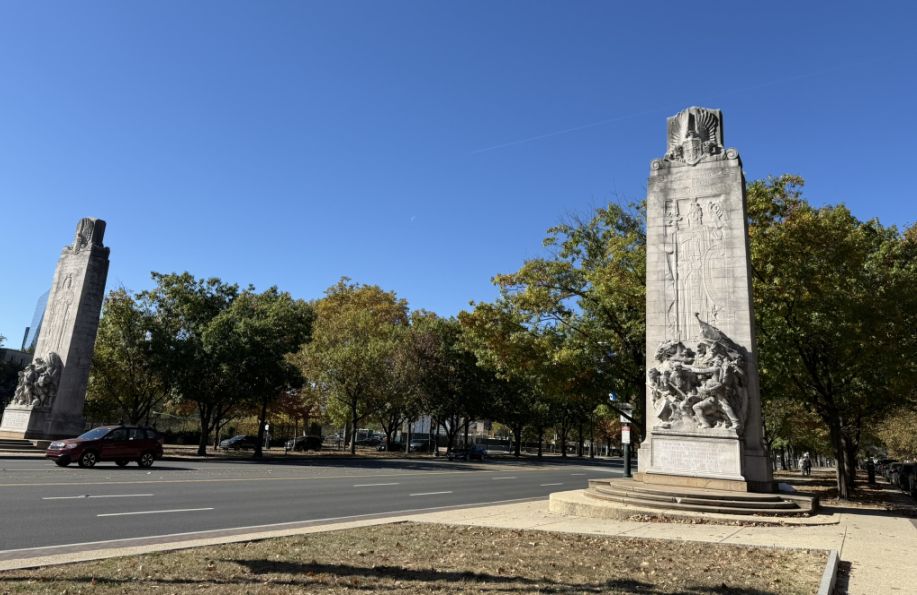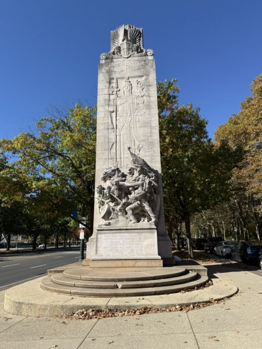 We are now Benjamin Franklin Parkway at Logan Circle, and there are two huge stone walls with sculptures called Civil War Soldiers and Sailors Memorial. Each wall is a large granite block, they face each other across a small plaza/