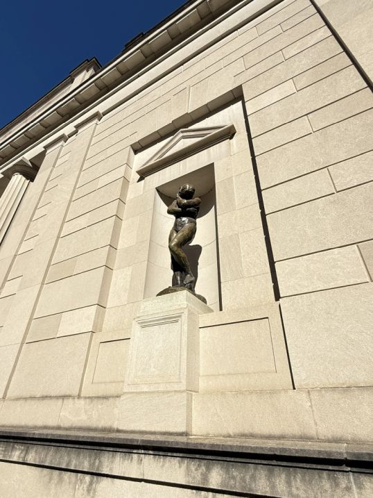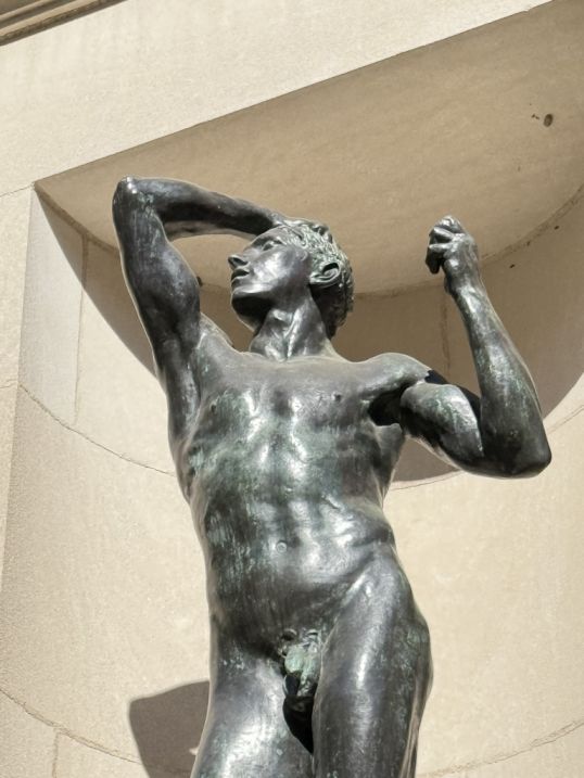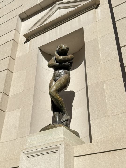 On either side of the façade, set into niches. The one on the right is Eve, Modeled in clay 1881, cast in bronze 1925, slightly turned inward, her posture modest and introspective. Her body feels both powerful and vulnerable, as if caught in a moment of self-awareness.