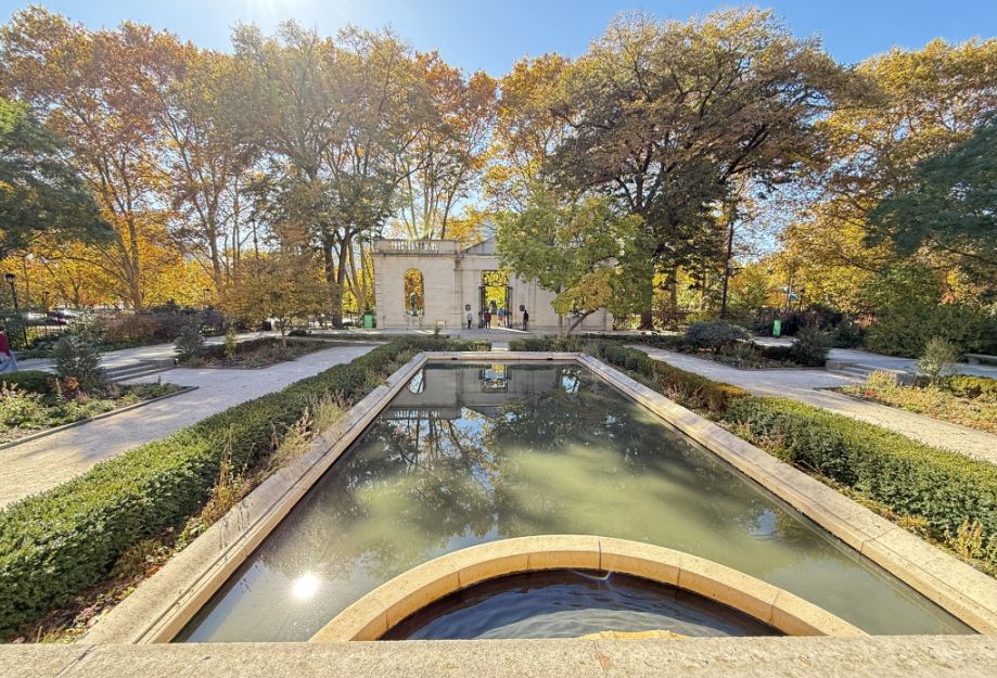 After passing the gate and moving along the path, we arrive at the long, rectangular reflecting pool, one of the most beautiful features of the museum grounds.