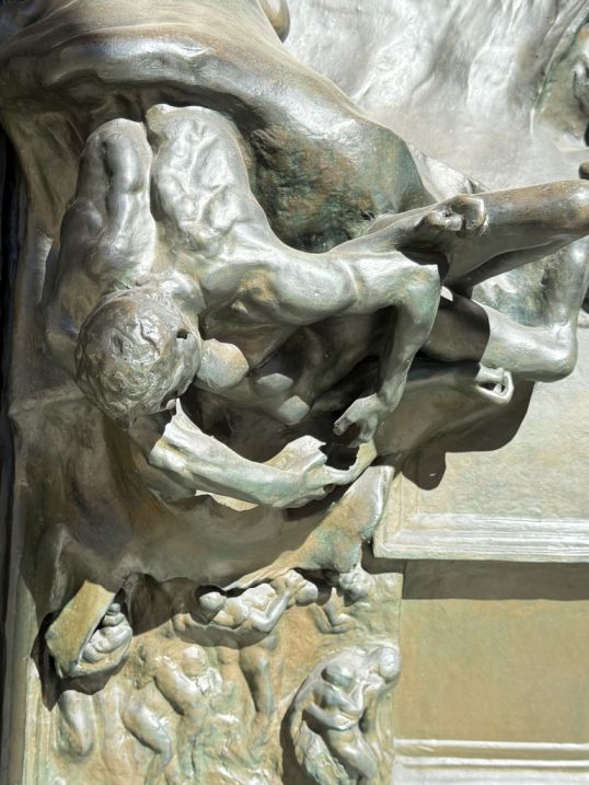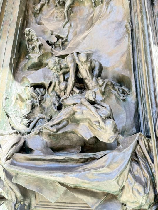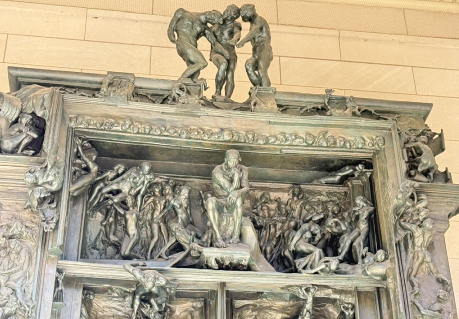 Between the columns stands Rodin’s monumental The Gates of Hell. This enormous bronze portal is covered with writhing, layered figures inspired by Dante’s Inferno.