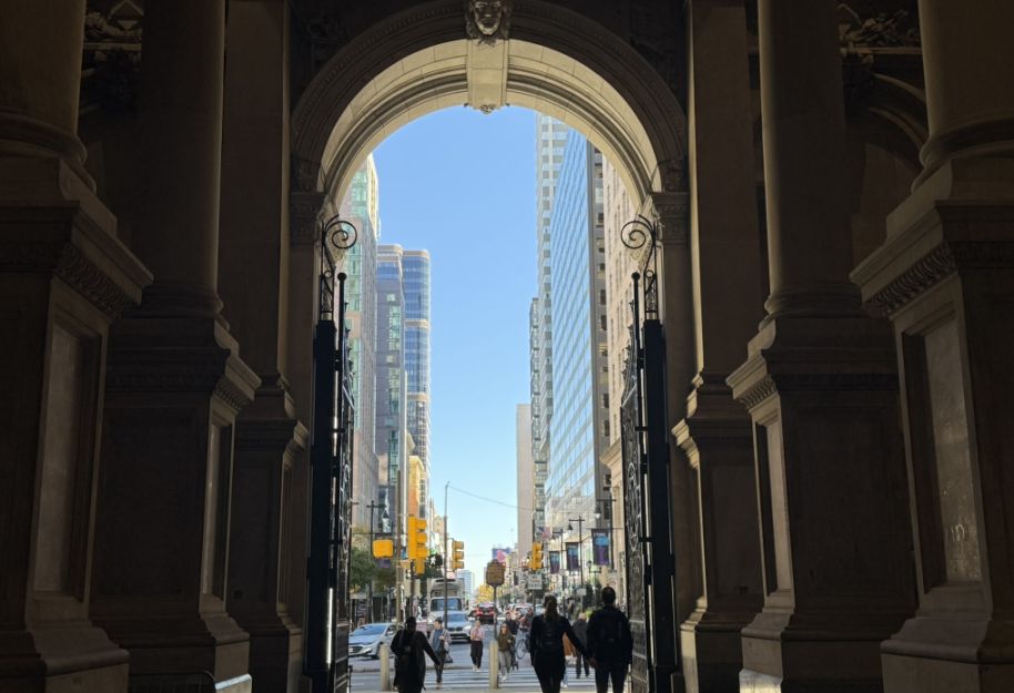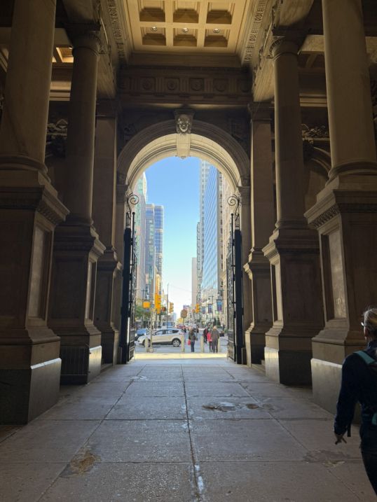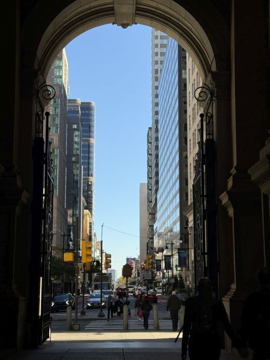 This is the classic contrast that makes City Hall so unique. We are standing within a monumental 19th-century structure, a masterpiece of ornate masonry, peering through its meticulously crafted arches. Framed by these historic arches, we see the gleaming, modern glass and steel of contemporary skyscrapers. This juxtaposition perfectly illustrates Philadelphia's blend of deep history and modern urban development. It's a conversation between eras.