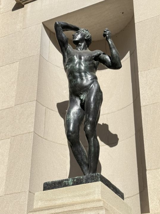 on the left is the Age of Bronze, Modeled in clay 1875-77, cast in bronze 1925, one of Rodin’s earliest masterpieces. The figure stands upright with one arm lifted, astonishingly lifelike. When first exhibited in 1877, critics accused Rodin of casting it from a live model because it was so realistic.