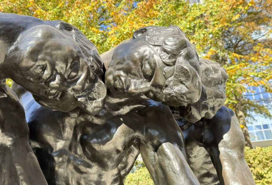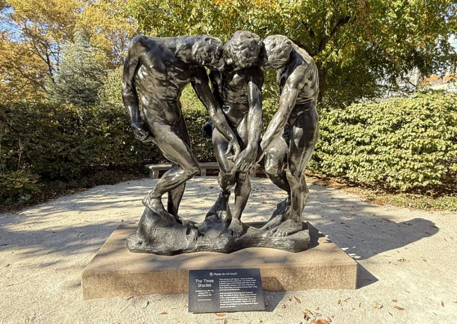 Closer view of the monumental outdoor version of The Three Shades in the garden. Standing alone and enlarged, it feels even more dramatic. Without the surrounding chaos of the Gates, you can fully see the muscular tension, the bending spines, and the emotional weight pulling them forward.