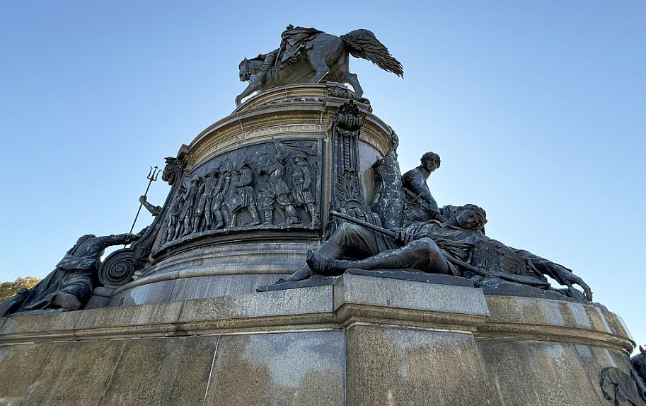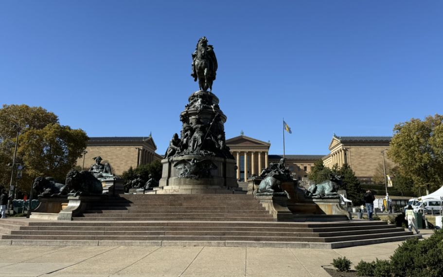 The Washington Monument at Eakins Oval, the grand equestrian statue of George Washington that anchors the foot of the Parkway before the steps of the Philadelphia Museum of Art. The monument was designed by German-American sculptor Rudolf Siemering and dedicated in 1897. It was one of the first major public monuments placed along what would later become the Benjamin Franklin Parkway.