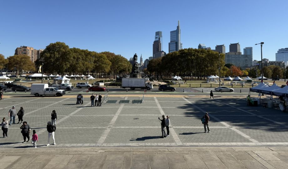 From the summit, the view is one of the best in Philadelphia, City Hall centered in the distance, fountains and flags lining the boulevard, the city unfolding right beneath.