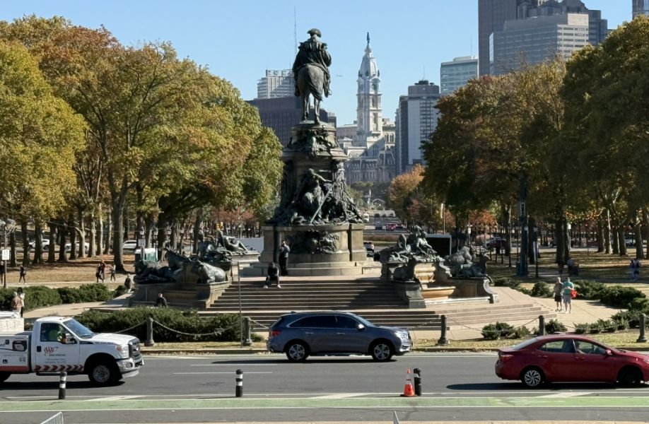 From this angle, you are looking directly at the back of Washington on horseback, framed perfectly by the Parkway. The monument looks almost like a dramatic stage set below. Below the monument, you see the Parkway stretching toward City Hall (the tall tower in the center).