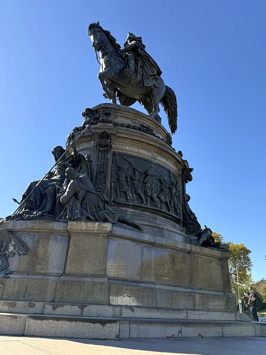 On the top tier George Washington sits on horseback, Calm, solemn, surveying the land, facing directly down the Parkway toward City Hall.