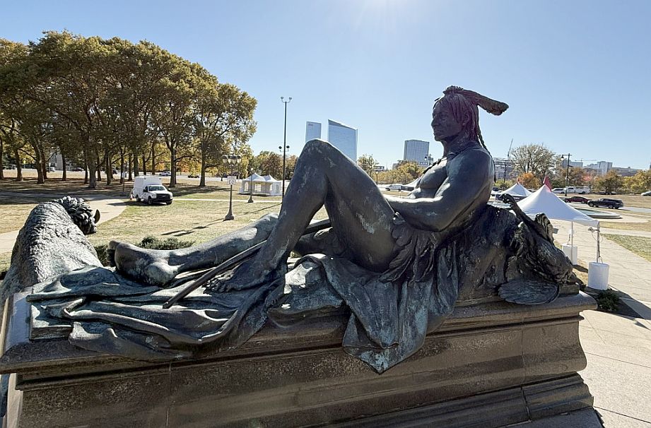 Beneath Washington on horseback is a circular group of historical and allegorical figures. American Indians are depicted in thoughtful, dignified poses, Representing the original inhabitants of the continent.