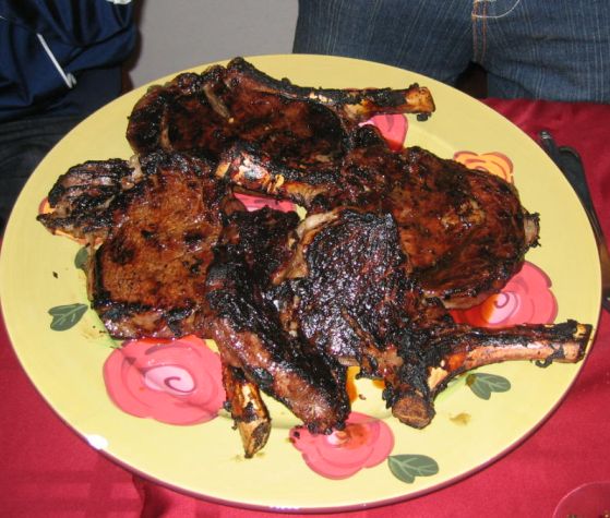 Here is the star of the evening...a platter of the best Cowboy Rib Eyes grilled to perfection! Remember what I said of the caramelized crust on top of the steaks? look at the picture! |