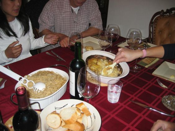 Garlic and butter spaghettis prepared by Huyen and Potatoes gratin baked by Hanh |