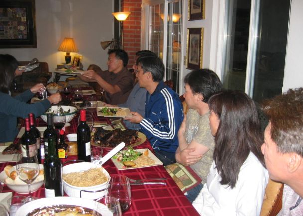 Plates are passed around, Side dishes are filling up the plates and a everyone is looking forward to bite in the juicy Cowboy Steaks and wash it down with a nice glass of wine!