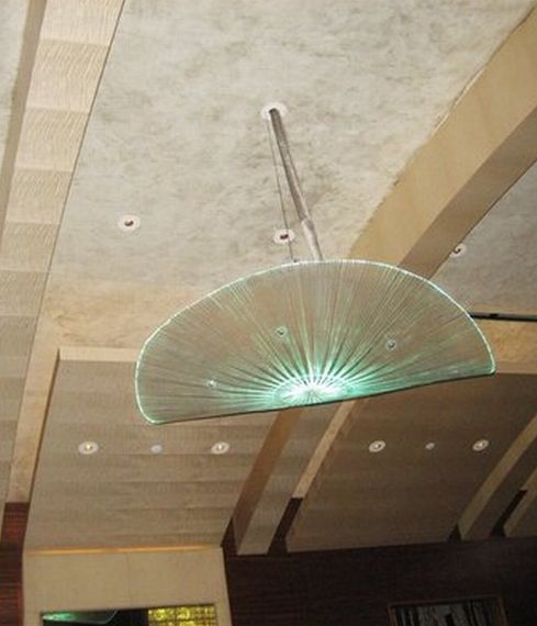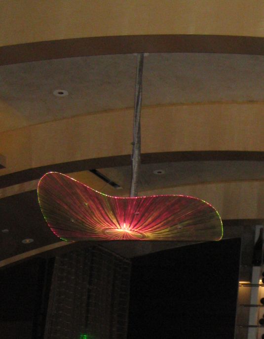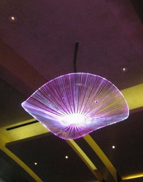 The chandeliers are made of fiber optics that change from steely silver to vivid green, pink, aqua and a mixture of colors. |