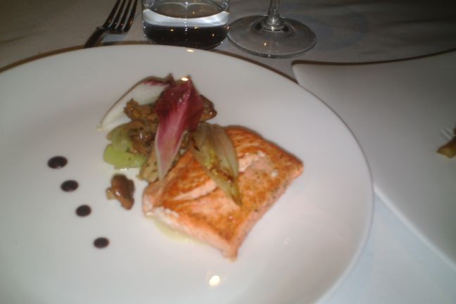 Since Tuan Vu can not eat beef, the chef substituted it for Scottish Salmon, Belgian endive, violet mustard, smoked almonds, Chanterelle mushrooms.