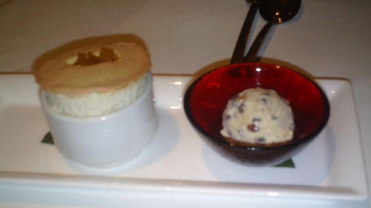 Soufflé, with rum raisin ice cream, roasted pineapple |