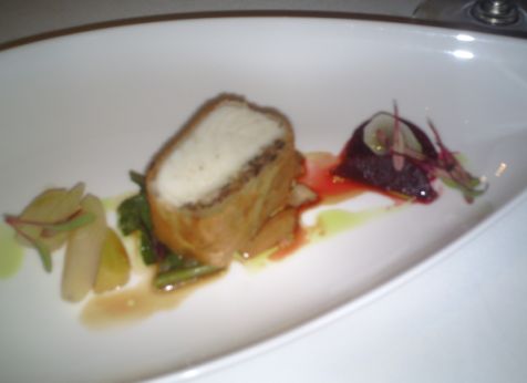 Wild Columbia River Sturgeon wrapped in brick leave with mushroom strudel, beet & salsify salad.
