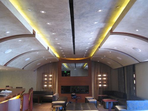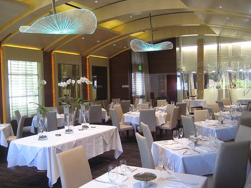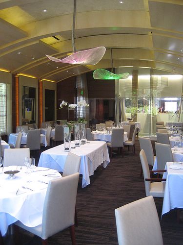 The Main dinning room can accommodate up to 100 guests. The chandeliers are made of fiber optics that change from steely silver to vivid green, pink and aqua. |