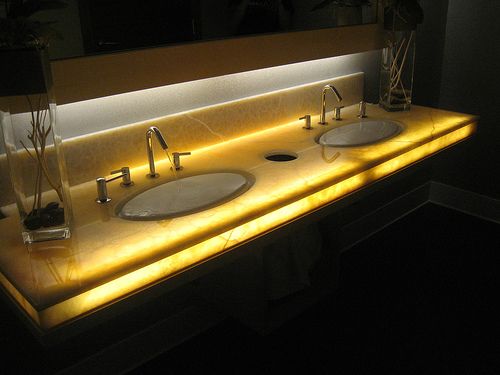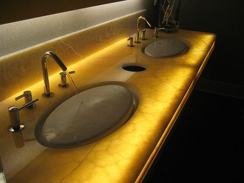 What a cool bathroom! What an interesting concept to have a flat top sink so it gives the impression that the water is going to spill over but of course it does not.... I also like the way the marble is lit up underneath the sink.
