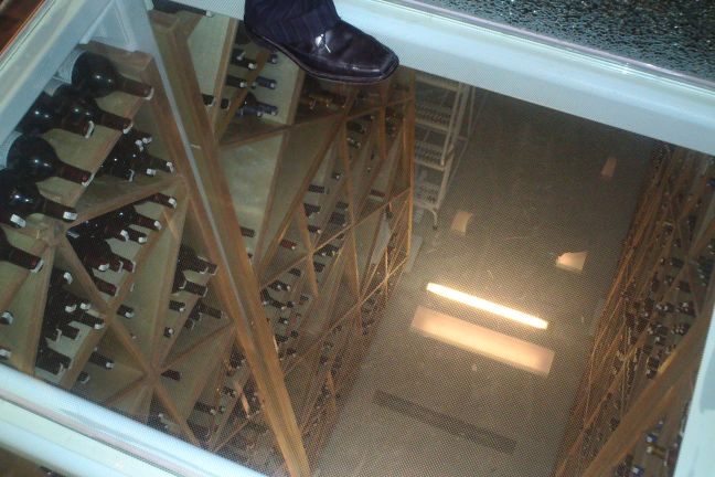 This the glass floor looking down at the cellar below. On the top left corner you can see the shoe of our head waiter.