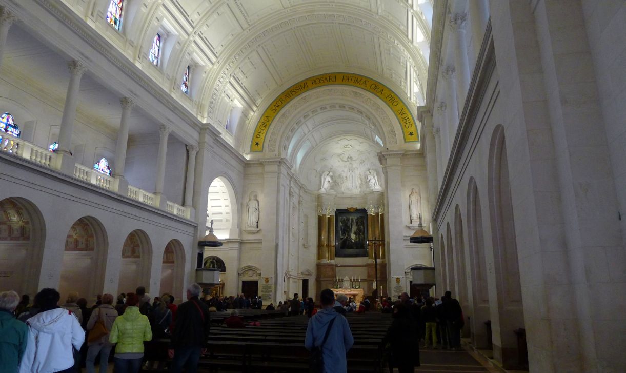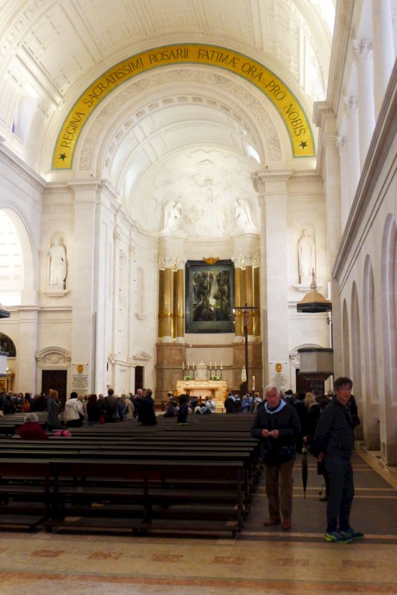 Interior of the Basilica: "Queen of the Most Holy Rosary of Fatima, Pray for us." It was at the last apparition that the Lady told the children she was the "Lady of the Rosary."