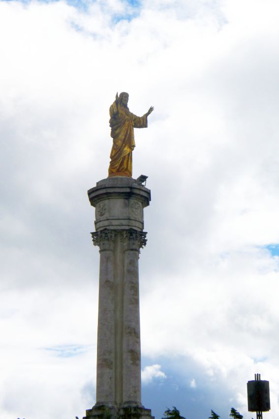 The monument to the Sacred Heart of Jesus, in the center of the square (which is over a spring of water) with the Basilica in the background.