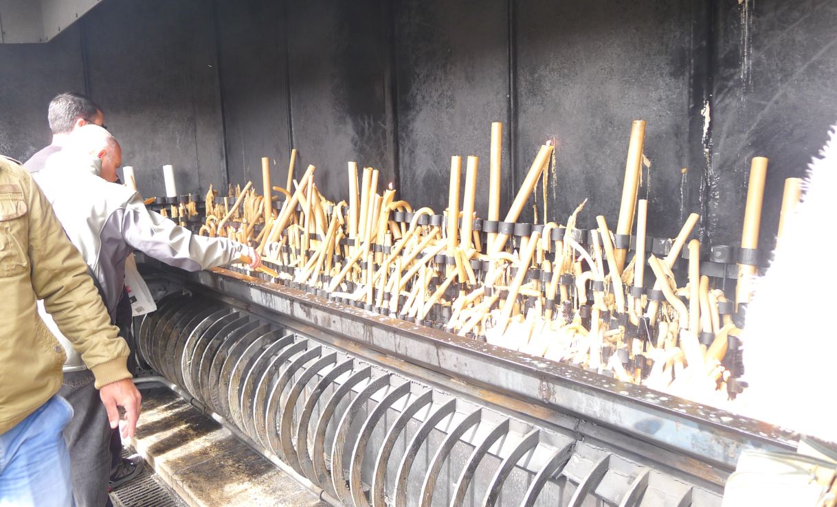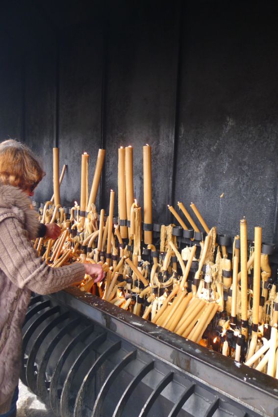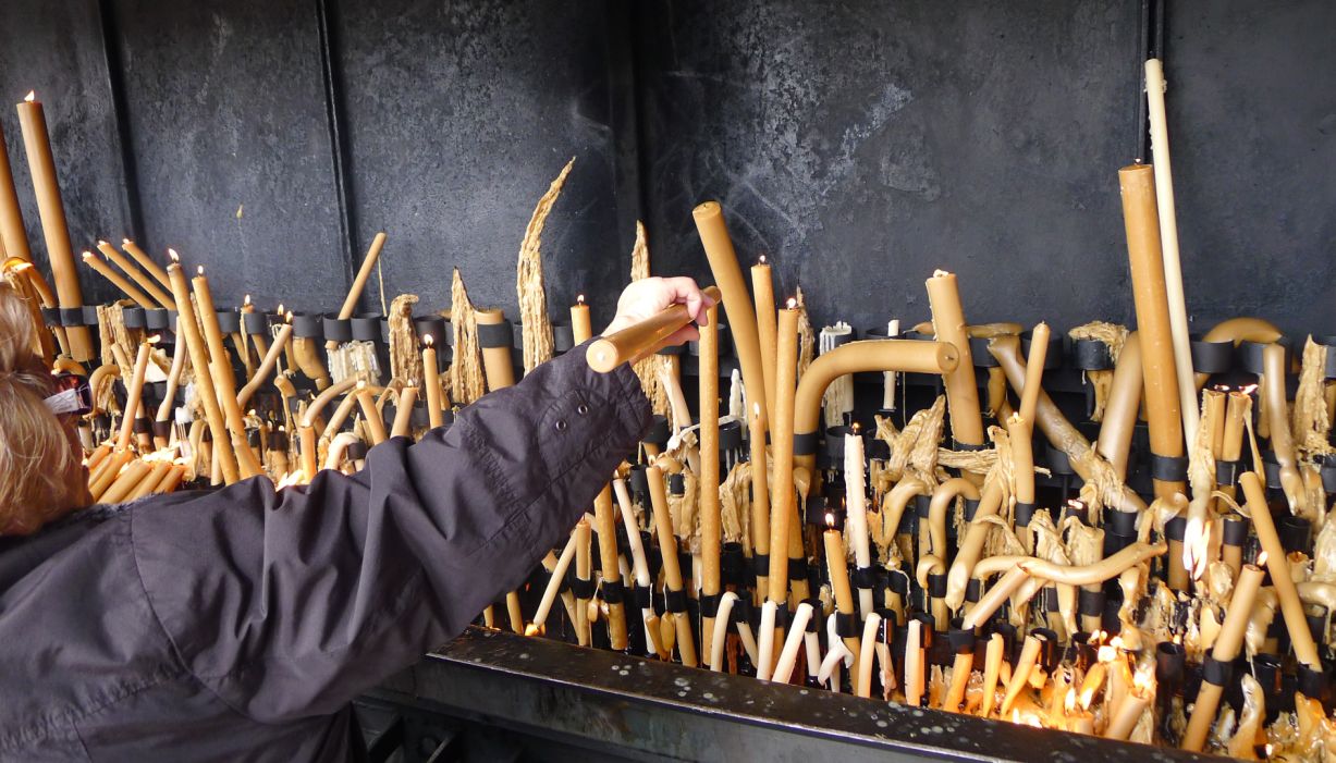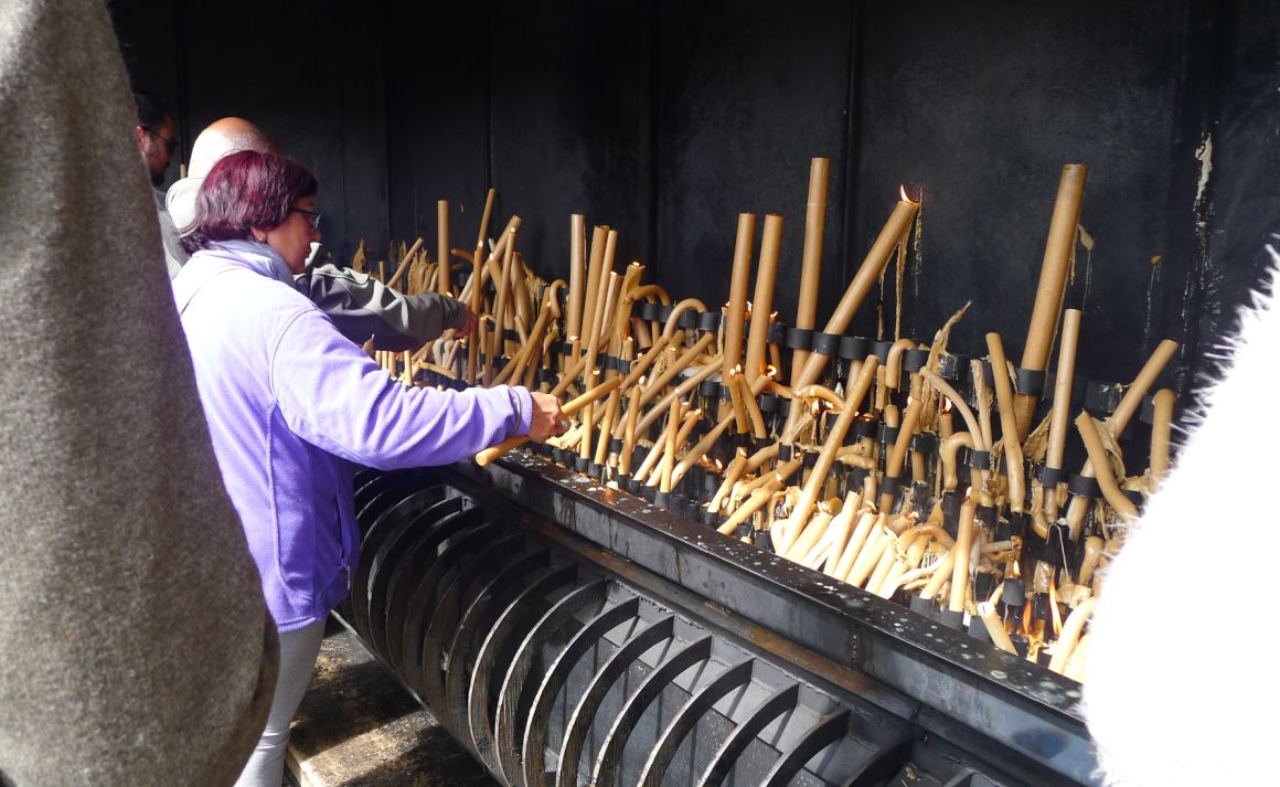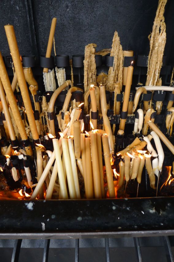 Place for lighting and leaving candles with an inferno below where the wax melts into a trench and flows into a vat to be resurrected as new candles.