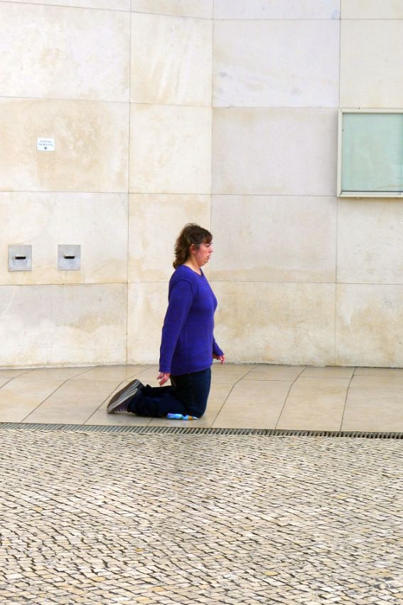 A believer praying on her knees until she reaches the chapel of apparitions. |