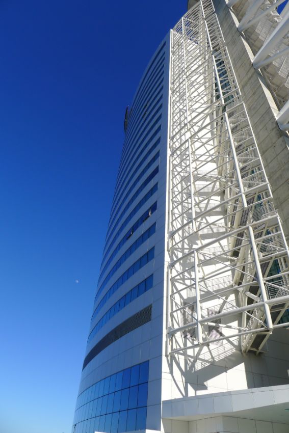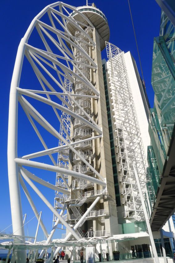 The Vasco da Gama Tower is a 475 feet lattice tower with skyscraper built over the Tagus river. The steel structure represent the sail of a caravel ship.
