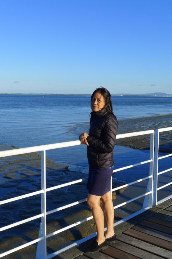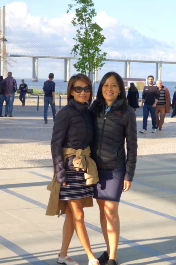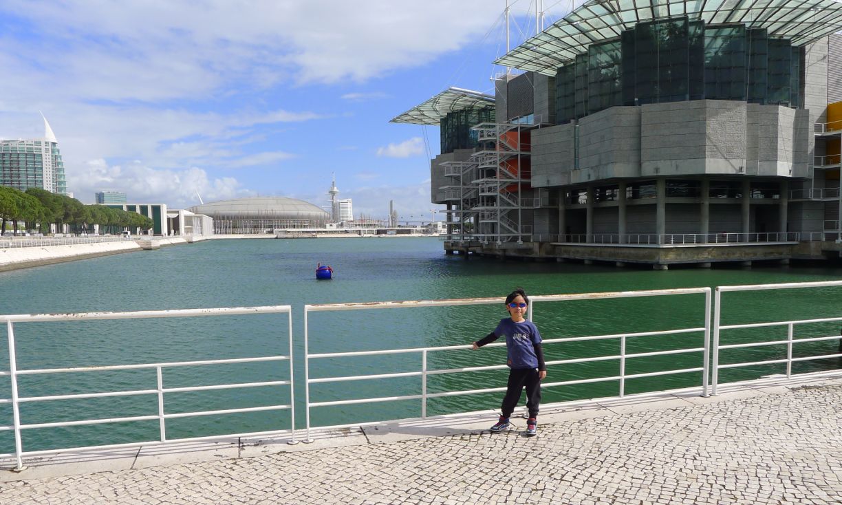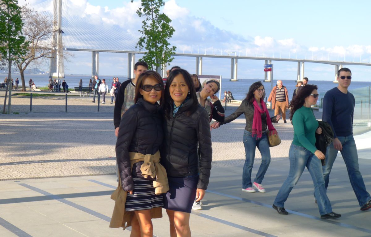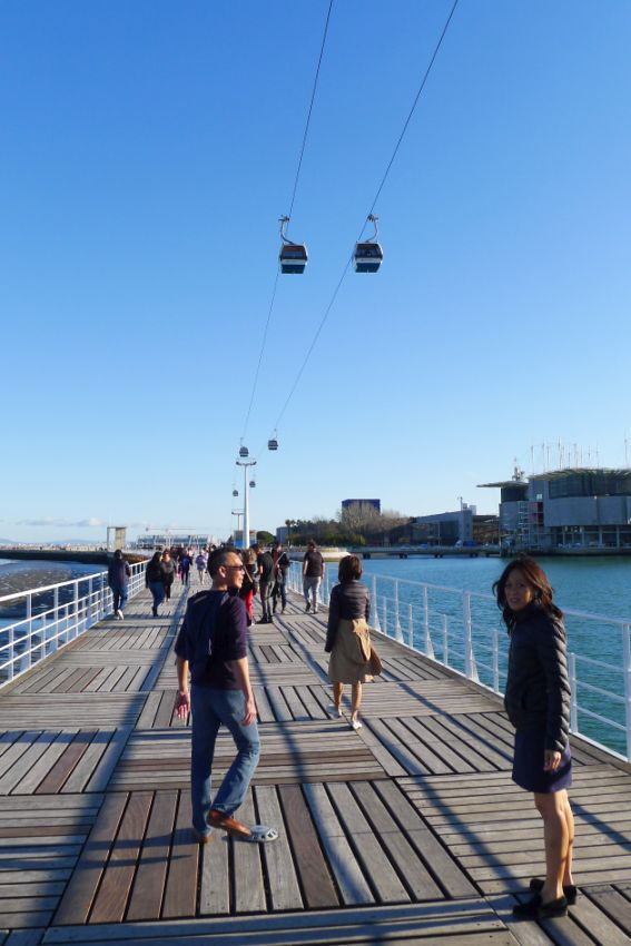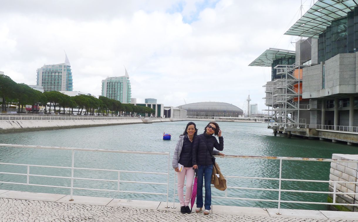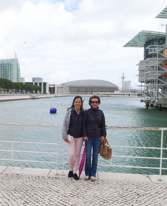 Loan and I at the Marina. In the background you can see the Torre São Gabriel (left) and the Atlantic Pavilion concert hall (in the middle) with the oval roof. |